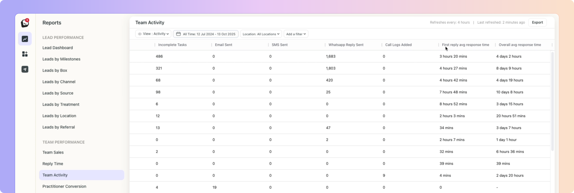 Every time a team member takes an action on a lead, such as sending a reply, creating a task, logging a call, or adding a note, it’s recorded in the Team Activity Report, even if they’re not the assigned owner of the lead.