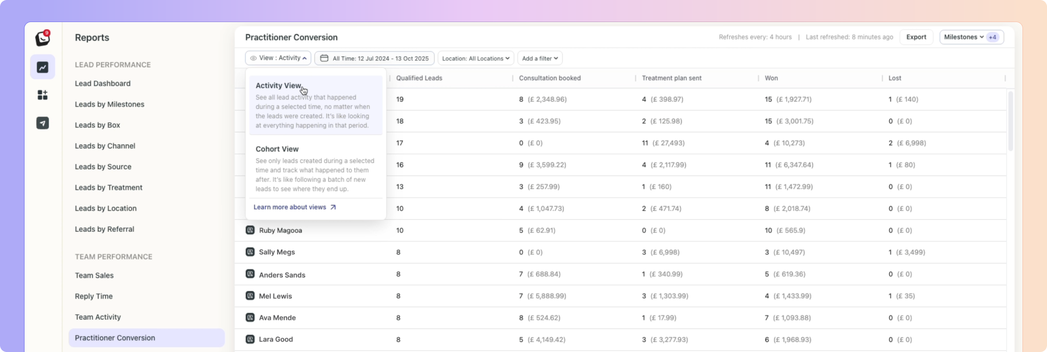 If a lead came in last month but booked a consultation this week, Activity View will now include it.