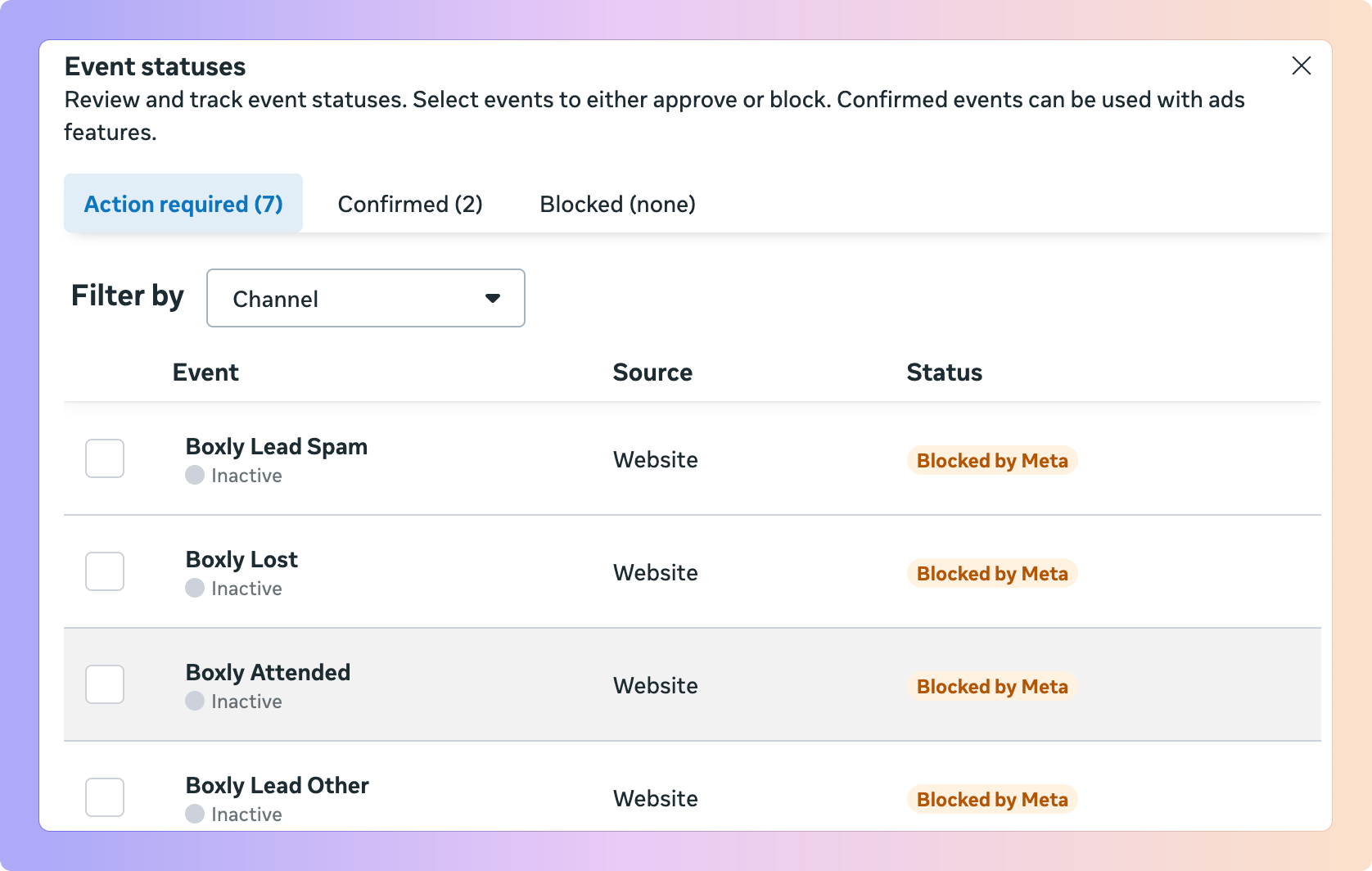 When tracking is set up correctly, Boxly automatically sends key conversion events to your connected ad accounts.
