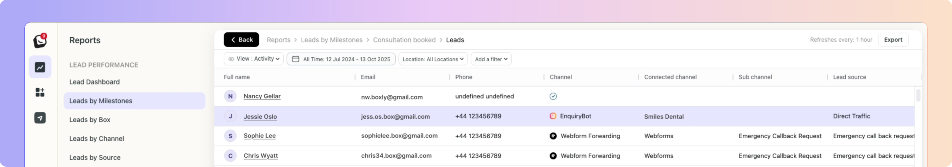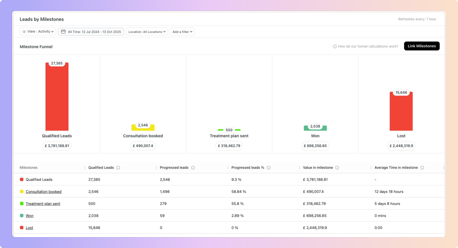 If your Consultation Booked milestone shows 2,546 leads, you can now click it to see exactly where they are today:- 780 moved to Treatment Plan Sent