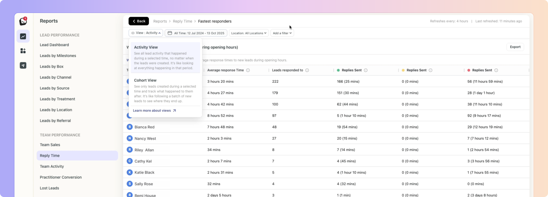 If that lead is later reassigned to Danny, his response time starts from the customer’s last message and ends at his next action, not from when the lead was first created