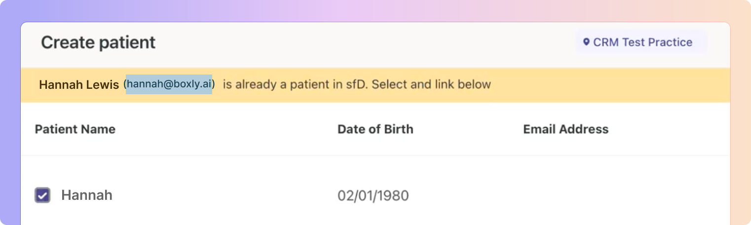 A patient can be created only once per lead.If multiple leads in Boxly contain the same patient details: