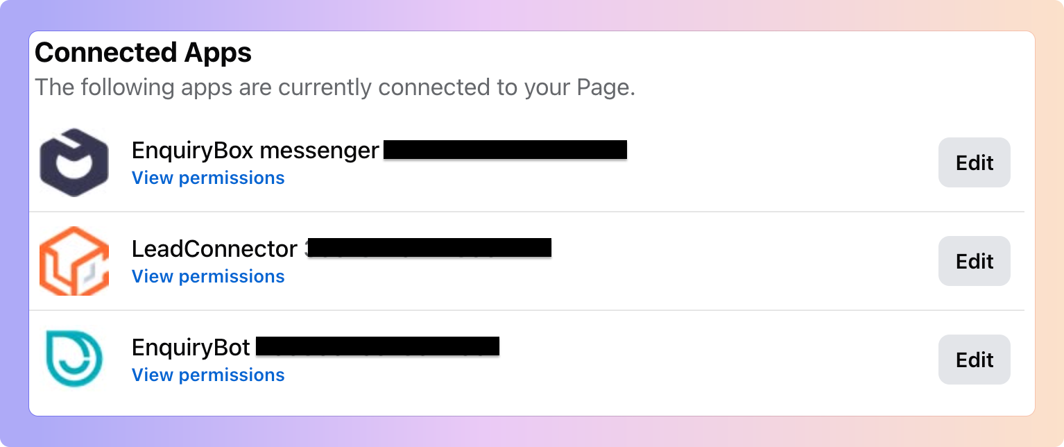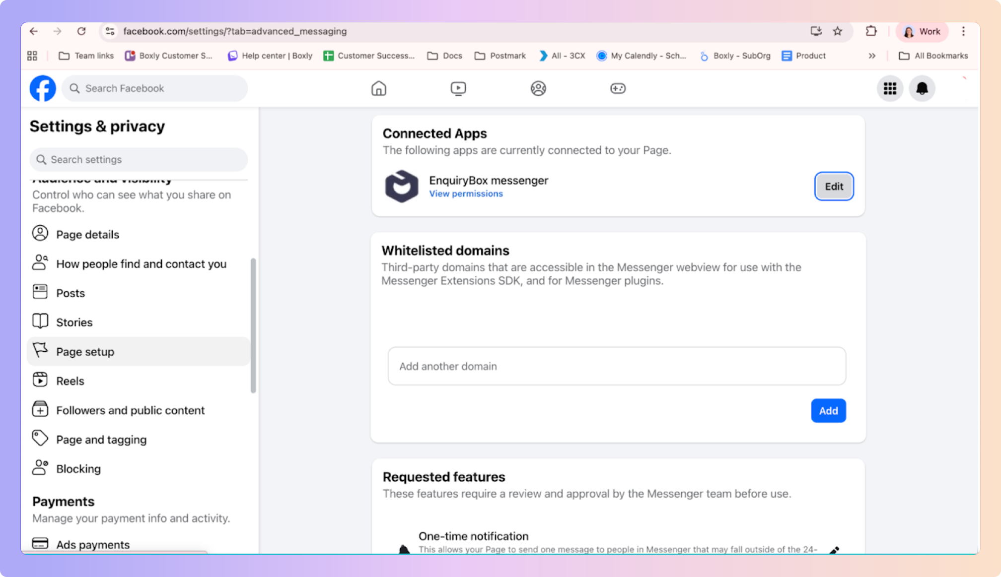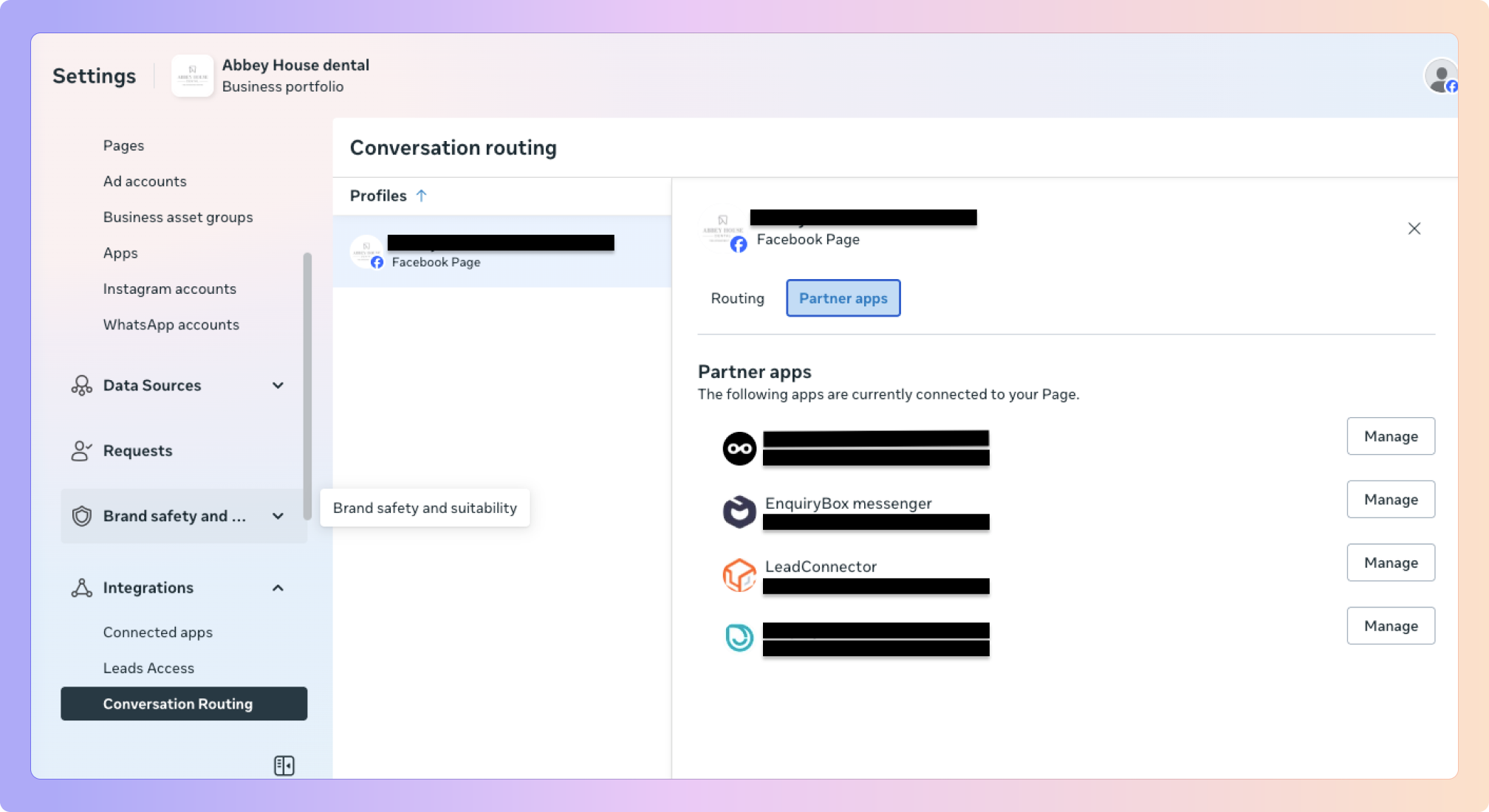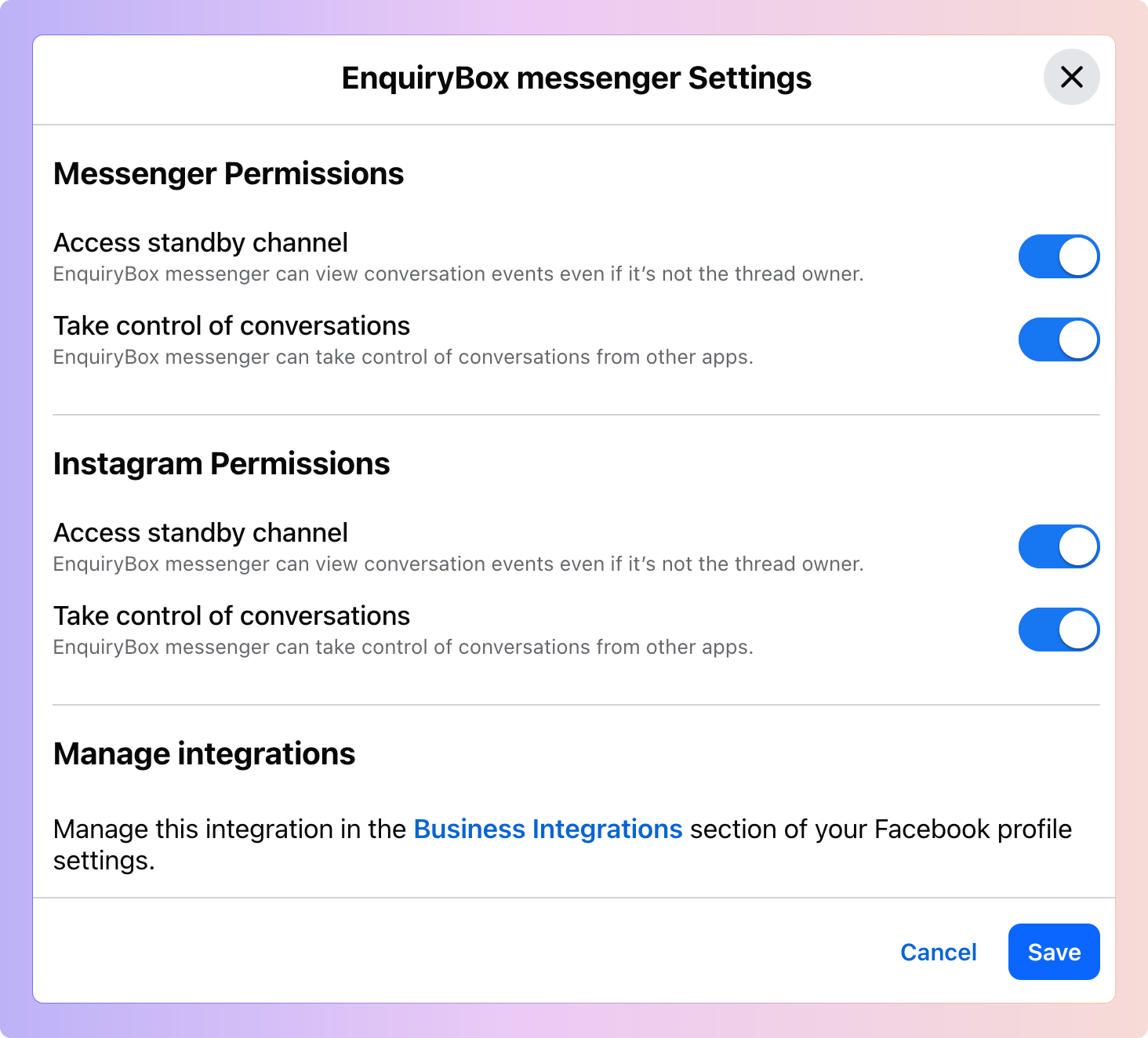 Make sure Enquirybox is the Primary receiver and all other toggles are switched off. Sometimes Meta has Messenger as the primary receiver, and you will only be able to see messages in the Facebook Messenger app