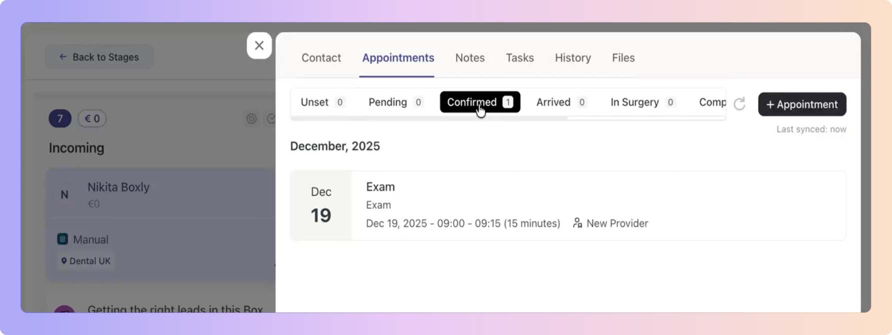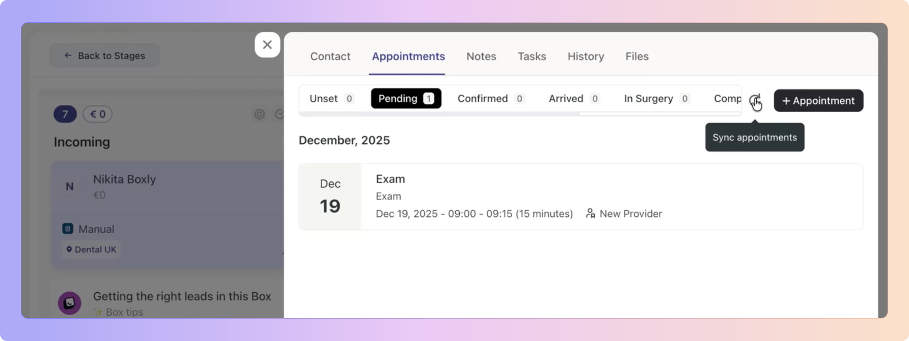 Appointments created in Exact PMS can be manually synced into Boxly.