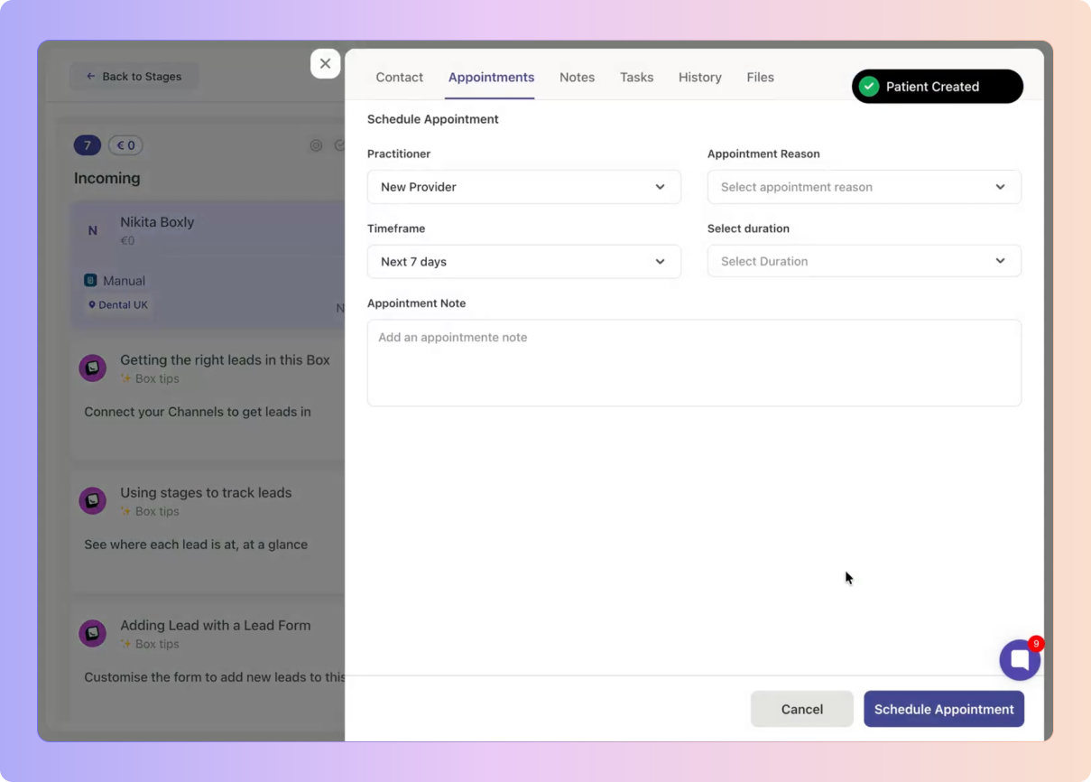 If an appointment is cancelled in Exact PMS, this update can also be synced into Boxly.