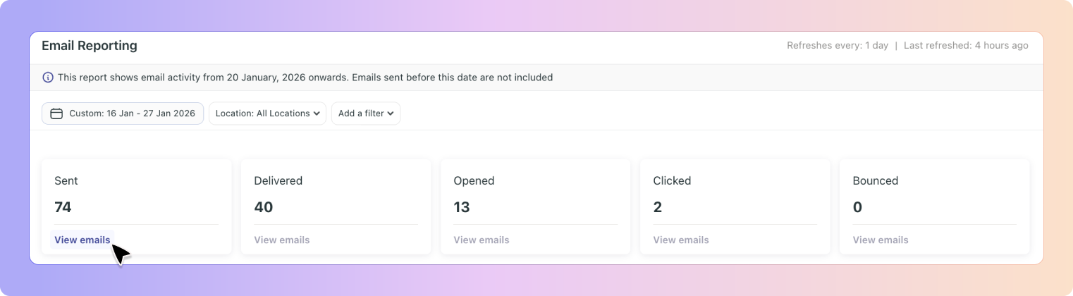 Instead of guessing whether emails were delivered, opened, or clicked, the Email Report gives you a clear view of email activity in one place. It’s designed to help you quickly understand engagement and make better follow-up decisions.