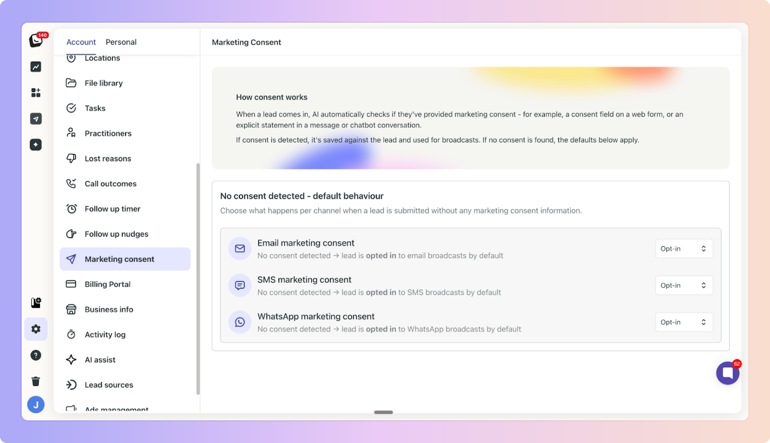 Marketing Consent allows your practice to manage whether leads receive marketing and promotional communications via email, SMS, and WhatsApp.